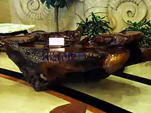 Une table de thé chinois sculptée à partir d'une racine d'arbre. Chacune des « terrasses » draine le thé dans un réservoir de déchets sous la table.