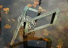 Sous condition qu'il y ait de l'eau dans le bassin et encore de la position du soleil, l'œil averti de perspective s'étonnera que le reflet de cet élément apparemment hétéroclite forme une figure géométrique régulière[10] : le reflet montre un cercle enchâssé dans un carré lui-même inscrit dans un triangle. Cette figure fait référence au principe du plan directeur de Bernard Tschumi[11].