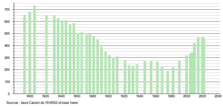 L'évolution du nombre d'habitants est connue à travers les recensements de la population effectués dans la commune depuis 1793. Pour les communes de moins de 10 000 habitants, une enquête de recensement portant sur toute la population est réalisée tous les cinq ans, les populations légales des années intermédiaires étant quant à elles estimées par interpolation ou extrapolation[20]. Pour la commune, le premier recensement exhaustif entrant dans le cadre du nouveau dispositif a été réalisé en 2004[21].