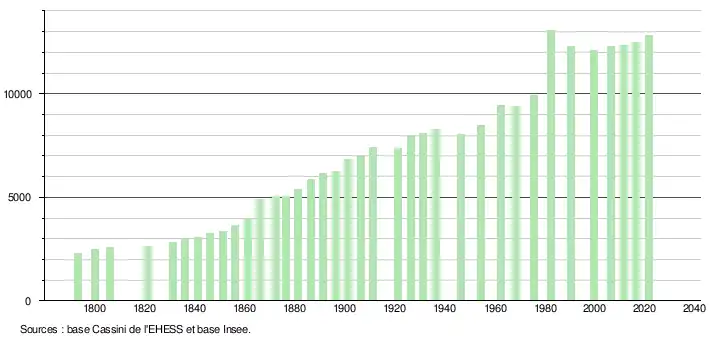 - Par convention dans Wikipédia, le principe a été retenu de n’afficher dans le tableau des recensements et le graphique, pour les populations légales postérieures à 1999, que les populations correspondant à une enquête exhaustive de recensement pour les communes de moins de 10 000 habitants, et que les populations des années 2006, 2011, 2016, etc. pour les communes de plus de 10 000 habitants, ainsi que la dernière population légale publiée par l’Insee pour l'ensemble des communes.