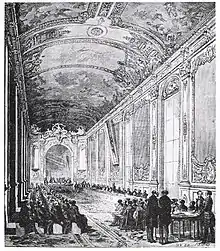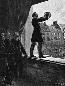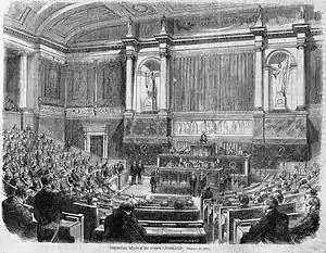 Les élections du 31 mai 1863 interviennent dans un contexte marqué par des difficultés économiques liées aux mauvaises récoltes, à leurs effets désastreux sur l'industrie textile, en raison de la pénurie de coton, du blocus des côtes sudistes par les troupes de Lincoln, provoquant faillites et montée du chômage[43]. Plus de 300 candidats d'opposition se présentent, les plus nombreux étant les républicains alors même que, depuis 1858, le serment de fidélité à la Constitution est exigé de tous les candidats et non plus seulement de ceux qui sont élus. Des alliances sont contractées entre monarchistes et républicains, notamment à Paris où l'orléaniste mais néanmoins empreint d'idées républicaines Adolphe Thiers se présente sur une liste unique comprenant une majorité de candidats républicains[44]. Finalement, avec 5 308 000 suffrages, les candidats gouvernementaux perdent des suffrages tandis que l'opposition obtient 1 954 000 votes et 32 sièges (17 républicains et 15 indépendants dont Thiers) alors que le taux d'abstention recule fortement (27 %). Si par leur vote, les campagnes et les villes inférieures à 40 000 habitants ont soutenu les candidats officiels, les suffrages des grandes villes sont allés majoritairement à l'opposition[45]. Néanmoins, de grandes personnalités de l'opposition tels Charles de Rémusat ou le Comte de Montalembert subissent un échec dans leur tentative de retrouver les bancs de l'Assemblée.