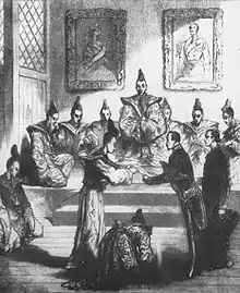 Le décret du 24 novembre 1860, complété par les sénatus-consultes des 2 et 3 février et du 31 décembre 1861, réforme la constitution de 1852. Il s'agit pour Napoléon III de donner aux grands corps de l'État une participation plus directe à la politique générale du gouvernement[39]. Ainsi, le droit d'adresse du Sénat et du Corps législatif est rétabli, le droit d'amendement est élargi ainsi que les modalités de discussion des projets de loi. Un compte-rendu sténographique des débats est instauré et rendu public. L'empereur compte sur cette mesure pour tenir en échec l'opposition catholique montante, qui est de plus en plus alarmée par la politique de laissez-faire pratiquée par l'Empereur en Italie. Les modalités de discussion budgétaire sont elles aussi modifiées, le budget cessant d'être voté globalement par département ministériel, permettant à l'assemblée d'exercer un contrôle vigilant et rigoureux sur l'administration et la politique du gouvernement. Le fonctionnement de l'État tend alors à se rapprocher de celui d'une monarchie constitutionnelle[40]. Le Second Empire est alors à son apogée[41]. Pour Lord Newton, « Si la carrière de Napoléon III s'était terminée en 1862, il aurait probablement laissé un grand nom dans l'Histoire et le souvenir de brillants succès »[42].