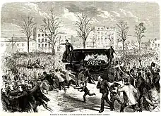 Les élections législatives de mai 1869 donnent lieu à des combats de rue, ce qui ne s'était pas vu depuis plus de 15 ans. Si les candidats favorables à l'Empire l'emportent avec 4 600 000 voix, l'opposition, majoritairement républicaine, rafle 3 300 000 voix et la majorité dans les grandes villes. Au Corps législatif, ces élections marquent le recul important des bonapartistes autoritaires (97 sièges) face au grand vainqueur, le Tiers Parti (125 sièges), et face aux orléanistes de Thiers (41 sièges) et aux républicains (30 sièges)[52]. Si le régime garde le soutien essentiel de la paysannerie, les ouvriers ont rallié pour la première fois en majorité les candidats républicains, ce qui sonne comme un échec pour la politique d'ouverture sociale de Napoléon III. L'union entre les internationalistes et les bourgeois républicains devient dès lors un fait accompli.