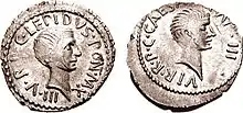 Le second triumvirat est une alliance politique réunissant Marc Antoine, consul de l'année -44 et ancien lieutenant de César, Lépide, ancien maître de cavalerie de César, et Octave, le futur empereur Auguste. Cet accord est scellé pour cinq ans à Bologne le 11 novembre -43 à l'initiative d'Antoine et de Lépide. Il représente l'union des héritiers politiques de César face aux sénateurs qui ont proclamé Antoine et Lépide ennemis publics, et aux républicains, partisans des meurtriers du dictateur.