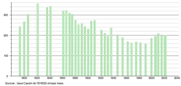 L'évolution du nombre d'habitants est connue à travers les recensements de la population effectués dans la commune depuis 1793. Pour les communes de moins de 10 000 habitants, une enquête de recensement portant sur toute la population est réalisée tous les cinq ans, les populations légales des années intermédiaires étant quant à elles estimées par interpolation ou extrapolation[17]. Pour la commune, le premier recensement exhaustif entrant dans le cadre du nouveau dispositif a été réalisé en 2005[18].
