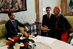 La secrétairerie d’État est dirigée par le cardinal secrétaire d'État, « premier collaborateur du pape dans le gouvernement de l’Église universelle »[7]. Le cardinal secrétaire d'État travaille et habite dans la même aile du palais apostolique que le pape (au premier étage de l'aile orientale de la cour Saint-Damase). En raison de la très grande proximité qu'il entretient avec le pape, le cardinal secrétaire d'État est seul chef de dicastère de la curie romaine à ne pas être nommé pour cinq ans mais « ad nutum Summi Pontificis » (selon la volonté du Souverain Pontife)[8]. Cela signifie qu'il est révocable à tout moment. Puisqu'il met en œuvre la diplomatie pontificale, le cardinal secrétaire d'État, accompagné du secrétaire pour les relations avec les États, rencontre les chefs d’État ou de Gouvernement, à l'issue de leur audience avec le pape, lorsqu'ils sont en visite officielle au Saint-Siège.