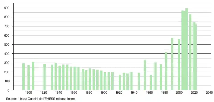 L'évolution du nombre d'habitants est connue à travers les recensements de la population effectués dans la commune depuis 1793. Pour les communes de moins de 10 000 habitants, une enquête de recensement portant sur toute la population est réalisée tous les cinq ans, les populations légales des années intermédiaires étant quant à elles estimées par interpolation ou extrapolation[16]. Pour la commune, le premier recensement exhaustif entrant dans le cadre du nouveau dispositif a été réalisé en 2004[17].
