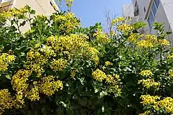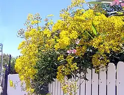 Senecio angulatus produit de nombreuses fleurs en grappes ouvertes au bout de ses branches ou tiges. Les fleurs parfumées sont sur une tige allongée et s'ouvrent successivement de la base vers le haut à mesure que la tige continue de croître. Les grappes de fleurs sont plus plates au sommet que pyramidales et mesurent 4 à 8 centimètres (1,6 à 3,1 pouces) de diamètre. Souvent, la grappe s'affaisse et les capitules à l'extrémité de la grappe se tournent vers le haut.