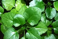Les feuilles sont rhombiques à ovales (larges en forme de losange), 3 à 5 centimètres (1,2 à 2,0 pouces) de long et 1 à 5 centimètres (0,39 à 1,97 pouces) de large et se présentent en 1 à 4 paires. Elles sont épaisses, brillantes, charnues et grossièrement dentées, avec une à trois dents de chaque côté et carrément lobées, les feuilles supérieures devenant plus petites avec moins de dents, voire aucune. Elles ont un aspect givré grâce à un revêtement poudreux sur la face inférieure.