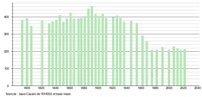 L'évolution du nombre d'habitants est connue à travers les recensements de la population effectués dans la commune depuis 1793. Pour les communes de moins de 10 000 habitants, une enquête de recensement portant sur toute la population est réalisée tous les cinq ans, les populations légales des années intermédiaires étant quant à elles estimées par interpolation ou extrapolation[36]. Pour la commune, le premier recensement exhaustif entrant dans le cadre du nouveau dispositif a été réalisé en 2006[37].