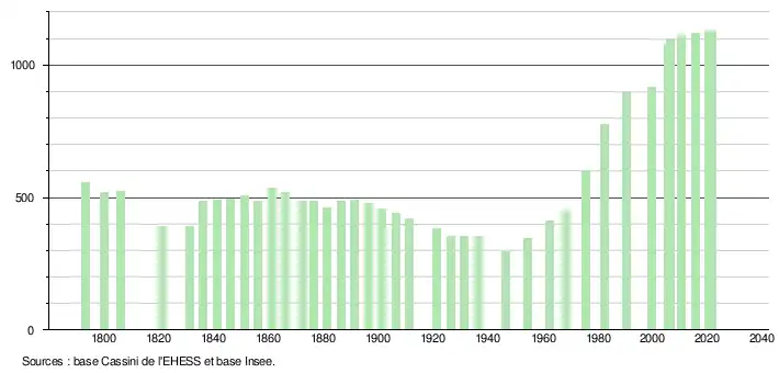 L'évolution du nombre d'habitants est connue à travers les recensements de la population effectués dans la commune depuis 1793. Pour les communes de moins de 10 000 habitants, une enquête de recensement portant sur toute la population est réalisée tous les cinq ans, les populations légales des années intermédiaires étant quant à elles estimées par interpolation ou extrapolation[22]. Pour la commune, le premier recensement exhaustif entrant dans le cadre du nouveau dispositif a été réalisé en 2005[23].