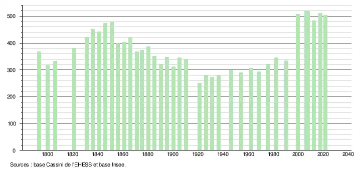 L'évolution du nombre d'habitants est connue à travers les recensements de la population effectués dans la commune depuis 1793. Pour les communes de moins de 10 000 habitants, une enquête de recensement portant sur toute la population est réalisée tous les cinq ans, les populations légales des années intermédiaires étant quant à elles estimées par interpolation ou extrapolation[18]. Pour la commune, le premier recensement exhaustif entrant dans le cadre du nouveau dispositif a été réalisé en 2007[19].