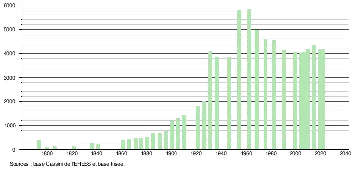 L'évolution du nombre d'habitants est connue à travers les recensements de la population effectués dans la commune depuis 1793. Pour les communes de moins de 10 000 habitants, une enquête de recensement portant sur toute la population est réalisée tous les cinq ans, les populations légales des années intermédiaires étant quant à elles estimées par interpolation ou extrapolation[27]. Pour la commune, le premier recensement exhaustif entrant dans le cadre du nouveau dispositif a été réalisé en 2004[28].