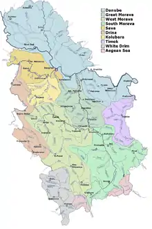 Tous les cours d’eau de Serbie appartiennent à trois bassins versants : celui de la mer Noire, celui de la mer Adriatique et celui de la mer Égée. Le plus vaste de ces bassins est celui de la mer Noire, qui couvre une superficie de 81 261 km2, soit 92 % du territoire du pays. Le bassin, dans son ensemble, est drainé par un seul fleuve, le Danube, qui se jette dans la mer Noire. Le bassin de drainage de la mer Adriatique couvre une superficie de 4 500 km2, soit 5 % du territoire de la Serbie. Il comprend la moitié occidentale du Kosovo-et-Métochie et il est principalement drainé par une rivière, le Drin blanc, qui rencontre le Drin noir en Albanie pour former le Drin, qui se jette dans la mer Adriatique. Une autre partie, de plus faible étendue, est drainée par la rivière Crni Kamen-Radika, au sud de la région de Gora (en). Le dernier bassin, celui de la mer Égée couvre une superficie de 2 650 km2, soit 3 % du territoire de la Serbie. Il est situé au sud du pays, près des frontières avec la république de Macédoine et la Bulgarie. Ce bassin est drainé par trois rivières : le Lepenac, la Pčinja et la Dragovištica. Les deux premières se jettent dans le Vardar en Macédoine, et la troisième se jette dans la Strymon en Bulgarie. Ces deux fleuves se jettent ensuite dans la mer Égée.