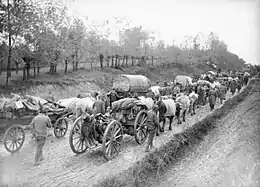La stratégie d’invasion de la Serbie prit forme et la direction des opérations fut confiée à August von Mackensen, qui s’était déjà illustré sur le front russe. Le l’offensive fut lancée au nord, et les Austro-Allemands prirent Belgrade le 9. Ils progressent alors vers le sud tout en rencontrant une vive résistance de la part des Serbes. Le 14 octobre, les Bulgares passèrent à leur tour à l’offensive. L’aide promise par les alliés anglais et français de la Serbie, en provenance de Salonique, n’arrivait pas[40]. Comme l’armée serbe était attaquée de tous côtés et menacée d’encerclement et de destruction (ce qui était le plan de Mackensen), le général Radomir Putnik donna l’ordre de se replier vers l’Albanie. Son plan était de gagner Durazzo, sur l’Adriatique et, de là, de rejoindre Corfou ; l’armée serbe, réorganisée, devait ensuite se rendre à Salonique, où se trouvaient déjà les Anglais et les Français.