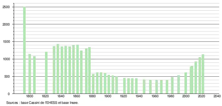 L'évolution du nombre d'habitants est connue à travers les recensements de la population effectués dans la commune depuis 1793. Pour les communes de moins de 10 000 habitants, une enquête de recensement portant sur toute la population est réalisée tous les cinq ans, les populations légales des années intermédiaires étant quant à elles estimées par interpolation ou extrapolation[25]. Pour la commune, le premier recensement exhaustif entrant dans le cadre du nouveau dispositif a été réalisé en 2007[26].