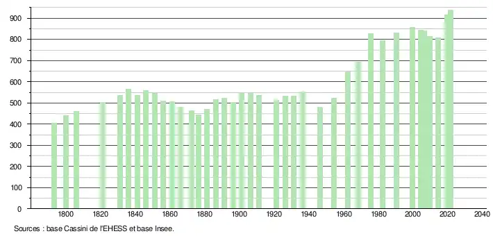 L'évolution du nombre d'habitants est connue à travers les recensements de la population effectués dans la commune depuis 1793. Pour les communes de moins de 10 000 habitants, une enquête de recensement portant sur toute la population est réalisée tous les cinq ans, les populations légales des années intermédiaires étant quant à elles estimées par interpolation ou extrapolation[23]. Pour la commune, le premier recensement exhaustif entrant dans le cadre du nouveau dispositif a été réalisé en 2004[24].