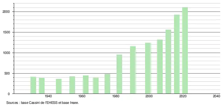 L'évolution du nombre d'habitants est connue à travers les recensements de la population effectués dans la commune depuis 1931. Pour les communes de moins de 10 000 habitants, une enquête de recensement portant sur toute la population est réalisée tous les cinq ans, les populations légales des années intermédiaires étant quant à elles estimées par interpolation ou extrapolation[20]. Pour la commune, le premier recensement exhaustif entrant dans le cadre du nouveau dispositif a été réalisé en 2006[21].