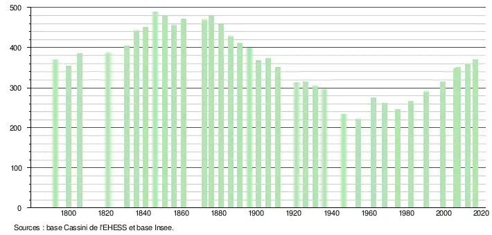 L'évolution du nombre d'habitants est connue à travers les recensements de la population effectués dans la commune depuis 1793. Pour les communes de moins de 10 000 habitants, une enquête de recensement portant sur toute la population est réalisée tous les cinq ans, les populations légales des années intermédiaires étant quant à elles estimées par interpolation ou extrapolation[15]. Pour la commune, le premier recensement exhaustif entrant dans le cadre du nouveau dispositif a été réalisé en 2007[16].
