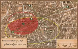 De plus, l'homme a pris un très grand risque en allant écrire un message sur un mur de Goulston Street après son deuxième meurtre. Pour Holmes, le tueur n'a pu prendre ce risque qu'en sachant qu'en cas de problème, son repli jusqu'à son domicile serait très rapide. Holmes estime que le meurtrier doit résider à l'intérieur d'une zone très resserrée (cerclée en rouge) autour du lieu où l'inscription a été tracée. Ainsi, en recoupant les deux espaces précédemment définis, le détective finit par délimiter la zone d'habitation de « Jack l'Éventreur », qui correspond au quartier d'Aldgate, voisin de Whitechapel.