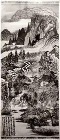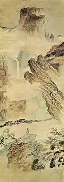 - La Cascade de Mingxianquan et le mont Hutouyan. Rouleau portatif, encre et couleur sur papier, 20 × 26 cm. Sen-oku Hakuko Kan (Sumitomo Collection), Kyoto
