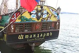 |  Poupe du Shtandart | .JPG.webp) Étrave de la frégate dans le port de La Rochelle. |  Détail de la dunette du Shtandart |