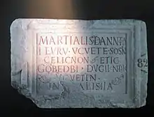 La découverte de la stèle d'époque gallo-romaine portant l'inscription « ALISIIA »[11] et dénommée « pierre de Martialis » a été retenue comme argument par les partisans du site. La stèle étant abîmée juste avant le premier A et l'espace précédant l'inscription étant plus large que dans le reste de la présentation générale de la stèle, on pourrait penser qu'une lettre aurait pu précéder le A. Mais d'une part, cette variation d'espacement n'est pas inhabituelle en épigraphie latine et d'autre part la découverte après 1970 de tessères (jetons de plomb) d'époque romaine a confirmé que le nom de la ville commençait, à cette époque, par ALI.