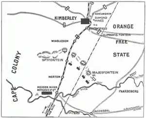 Les opérations de libération furent entamées dès novembre, lorsque 8 000 soldats britanniques commandés par Lord Methuen commencèrent à suivre à pied la voie de chemin de fer, à partir du fleuve Orange, en direction de Kimberley. Après deux victoires faciles sur les Boers à Belmont le 23 novembre et Grapan le 25, ils furent lourdement défaits le 28 à Modder River, ainsi que le 11 décembre à Magersfontein, bataille qui fut l'une des trois, avec celles de Colenso et Stormberg, qui consacrèrent ce qui fut connu dans l'opinion publique britannique comme la semaine noire.