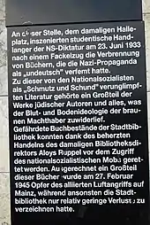 Plaque commémorative de l'autodafé du 23 juin 1933 sur la rive du Rhin à Mayence.