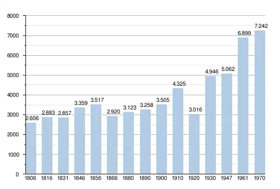 Contrairement au graphique précédent, celui-ci indique la population de toutes les anciennes communes formant des sections de l'actuelle commune de Nieuport soit Nieuport, Ramskapelle et Sint-Joris.