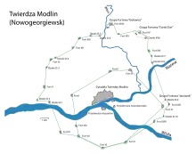 Les Russes décident de défendre la forteresse avec une garnison de 90 000 hommes, évacuée de Varsovie le . L'armée allemande dirigée par le général Hans von Beseler, comprenant la 87e division d'infanterie (corps Dickhuth) et le 17e corps de réserve, se dirige vers Novogeorgievsk avec 80 000 hommes appuyés par 18 obusiers de 300 mm et 400 mm qui avaient été utilisés pour s'emparer d'Anvers en 1914.