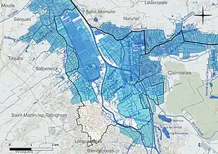 Par ailleurs la commune fait partie de l'aire d'attraction de Saint-Omer, dont elle est la commune-centre[Note 4]. Cette aire, qui regroupe 79 communes, est catégorisée dans les aires de 50 000 à moins de 200 000 habitants[34],[35].