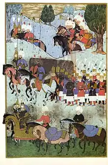 Le siège de Szigetvár ou bataille de Sziget (hongrois : szigetvári csata ; croate : bitka kod Sigeta ou Szigetska bitka ; turc : Zigetvar Kuşatması) est un siège de la forteresse de Szigetvár, à Baranya (près de l'actuelle frontière hongro-croate) qui a arrêté la progression de Soliman vers Vienne en 1566[9]. La bataille a opposé une garnison combattant au nom de la monarchie Habsbourg autrichienne sous le commandement du croate Nikola Šubić Zrinski (hongrois : Zrínyi Miklós) aux forces des envahisseurs ottomans sous le commandement du sultan Soliman le Magnifique (turc ottoman : سليمان Süleymān)[9].