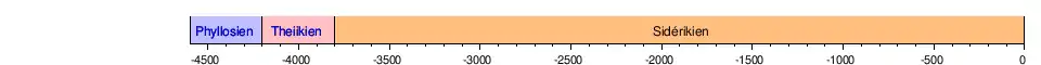 La datation précise de ces éons demeure largement incertaine, et l'analyse détaillée des résultats d'OMEGA suggère en fait une discontinuité entre le Phyllosien et le Theiikien, faisant coïncider le début de ce dernier avec l'Hespérien de la géologie martienne[4] tout en maintenant une durée moindre pour le Phyllosien que pour le Noachien, ce qui conduit du même coup à réajuster l'échelle des temps géologiques martiens :