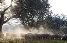 La sierra est également mise à profit depuis des siècles pour l'élevage d'ovins, de caprins et l'exploitation des chênes-lièges et des châtaigniers. La présence de nombreux chênes a permis le développement de l'élevage extensif de porcs ibériques, dont on tire les jambons ibériques de Jabugo, mondialement reconnus. L'homme a donc modifié la physionomie du paysage où les forêts alternent avec de vastes prairies (les dehesas) boisées et délimitées par des murs de pierre sèche[1].