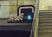 - pancarte « CM » signalant l'obligation pour le conducteur de passer en conduite manuelle. Elle aussi peut être affichée sur l'indicateur de quai sous l'acronyme « CMCP » ou « CMCC » sur les lignes équipées. Cela est généralement dû à l'impossibilité d'utiliser le tapis de pilotage automatique sur la prochaine partie de voie, en raison par exemple de travaux ayant entraîné sa dépose[15] ;