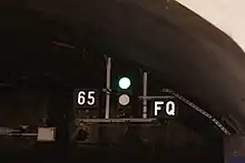 Le signal d'entrée en station comporte trois feux, rouge, vert et blanc. Un feu vert accompagné d'un tableau indicateur de vitesse autorise les trains à pénétrer en station à vitesse réduite dès que le train précédent a dégagé le signal de sortie de la station.
