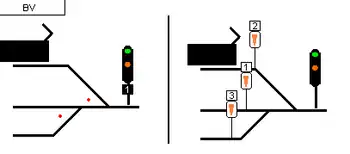 - Par un chiffre lumineux sous le signal principal indiquant le numéro de la voie. La voie numéro une étant toujours celle qui se situe du côté du bâtiment voyageur (ou BV dans le jargon ferroviaire). Ce mode n'est utilisable qu'avec le système L, car avec le système N emploie déjà un chiffre pour indiquer l'exécution de vitesse. Une telle situation est présentée dans la partie gauche de l'image ci-contre.