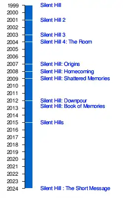 Silent Hill est une série de jeux vidéo de type survival horror éditée par Konami. Elle a débuté en 1999 avec Silent Hill sur PlayStation. Les quatre premiers volets de la série ont été développés par la « Silent Team » de Konami CE Tokyo, Silent Hill: Ørigins et Silent Hill: Shattered Memories ont été développés par Climax, et ce sont les équipes de Double Helix Games qui ont travaillé sur le développement de Silent Hill: Homecoming. Le dernier volet sorti, ayant comme nom Silent Hill: Downpour, est développé par le studio Vatra, qui fait partie du groupe Kuju Entertainment. Le volet suivant de la série, Silent Hills, devait être développé par Kojima Productions, mais a été annulé par Konami le , le titre restant à l'état de démo jouable.