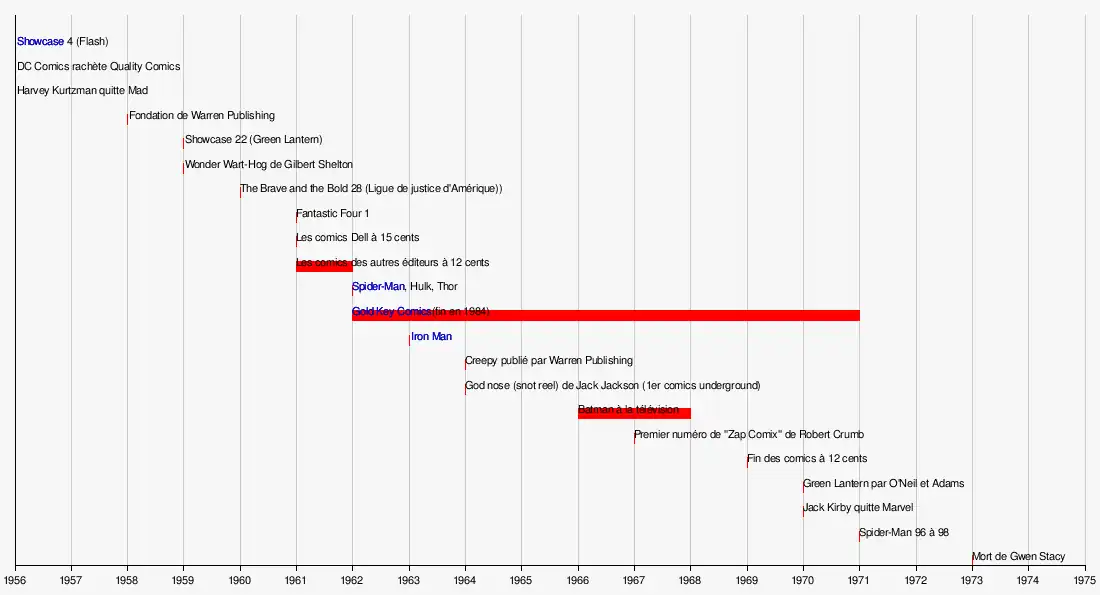 Après la Seconde Guerre mondiale, les comics de super-héros perdent leur lectorat au profit des comics d'horreur, des crime comics et des comics romantiques. Dans les années 1950, ces trois genres disparaissent à leur tour. De nombreux éditeurs sont alors dans la tourmente, avec l'instauration d'une instance de régulation qui, de fait, oblige les éditeurs à se censurer. Puis, c'est la disparition de la première société de distribution qui fragilise encore plus la profession. Il faut attendre 1956 pour que renaissent les comics de super-héros avec l'apparition d'une nouvelle version de Flash, dans Showcase no 4 (octobre 1956) publié par DC Comics. Bientôt suivie par la recréation de nombreux héros et le regroupement de plusieurs d'entre eux au sein de la Ligue de justice d'Amérique, cette résurrection est le point de départ de l'âge d'argent. D'autres éditeurs essaient alors de copier DC et c'est Marvel, sous la direction de Stan Lee, qui y parvient le mieux en lançant Les Quatre Fantastiques dans Fantastic Four no 1, publié en août 1961.