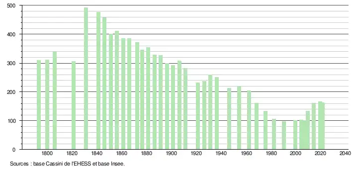 L'évolution du nombre d'habitants est connue à travers les recensements de la population effectués dans la commune depuis 1793. Pour les communes de moins de 10 000 habitants, une enquête de recensement portant sur toute la population est réalisée tous les cinq ans, les populations légales des années intermédiaires étant quant à elles estimées par interpolation ou extrapolation[26]. Pour la commune, le premier recensement exhaustif entrant dans le cadre du nouveau dispositif a été réalisé en 2004[27].