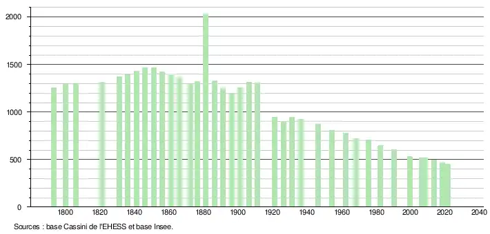L'évolution du nombre d'habitants est connue à travers les recensements de la population effectués dans la commune depuis 1793. Pour les communes de moins de 10 000 habitants, une enquête de recensement portant sur toute la population est réalisée tous les cinq ans, les populations légales des années intermédiaires étant quant à elles estimées par interpolation ou extrapolation[12]. Pour la commune, le premier recensement exhaustif entrant dans le cadre du nouveau dispositif a été réalisé en 2008[13].