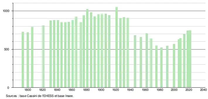 L'évolution du nombre d'habitants est connue à travers les recensements de la population effectués dans la commune depuis 1793. Pour les communes de moins de 10 000 habitants, une enquête de recensement portant sur toute la population est réalisée tous les cinq ans, les populations légales des années intermédiaires étant quant à elles estimées par interpolation ou extrapolation[33]. Pour la commune, le premier recensement exhaustif entrant dans le cadre du nouveau dispositif a été réalisé en 2008[34].