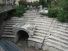 Le théâtre romain de Plovdiv est l'un des plus célèbres monuments de Bulgarie[4]. Il a été construit au début du IIe siècle, sous le règne de Trajan. Orienté au sud, il est adossé à un creux entre les deux collines de Djambaz Tepe et Taksim Tepe. Il forme un arc de cercle extérieur de 82 m.