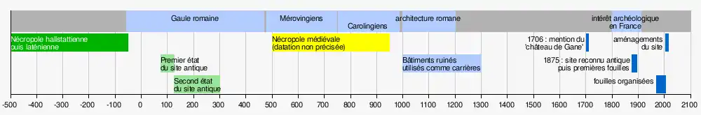 Les fouilles d'État, entreprises en 1976 par Claude Lambert et Jean Rioufreyt, et poursuivies jusqu'en 2006, permirent de mettre au jour la nécropole halstattienne, un théâtre antique de 3 000 places, un bâtiment peut-être à double vocation (forum et macellum), deux temples, dont l'un assez semblable extérieurement à la Maison Carrée de Nîmes, des thermes romains, et enfin un aqueduc alimentant l'ensemble du site. D'autres bâtiments, dont la fonction n'est pas connue, sont localisés mais restent à étudier.