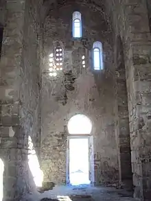 Lors des fouilles sous le plancher de la nef sud, un cercueil composé de plaques soigneusement découpées, a été découvert, son contenu aurait été pillé à une date inconnue. Dans l'angle nord-ouest du narthex, un réservoir de forme cubique (90 × 72 cm) évoque la présence de fonts baptismaux. Un escalier en bois menait aux chœurs, qui étaient portés par deux arcs en briques, soutenus par deux paires de pilastres.