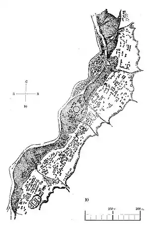 4. La ville . Le territoire de la ville ancienne (25 ha), très bien conservée, commence à la porte d'Hassan et à l'église centrale. Les bâtiments sont situés le long de trois rues d'environ 3 mètres de large auxquelles les archéologues ont donné des noms conventionnels. La rue Tsentralnaya assez droite, traverse tout la ville de la porte Podrovanaya jusqu'à la rivière et au cercle de pierre. La rue Podgornaya part de la rue Tsentralnaya près de la porte Podvorannaya et, après 220 mètres, se dirige vers le nord-est à la base de la chaîne de montagnes Uzhum. La rue Naberezhnaya longe une falaise jusqu'à la rivière sur plus de 500 mètres, pour finalement fusionner avec la rue centrale. Parmi les bâtiments, subsistent l'église sud, les ruines de trois chapelles, des bâtiments résidentiels et industriels, et les restes de cimetières chrétiens .