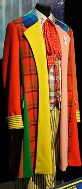 Colin Baker avait demandé que son Docteur porte une veste en cuir noir (ce qui fut le cas plus tard, en 2005, du neuvième Docteur de Christopher Eccleston) afin de refléter la personnalité plus sombre de son personnage[4]. Il a finalement obtenu un costume extrêmement coloré (qu'il décrira plus tard comme « une explosion dans une usine d'arc-en-ciel »[4]) : un long manteau rouge, avec des touches de vert, jaune et roses, qu'il met au-dessus d'une chemise blanche avec des points d'interrogations sur le col (déjà présents depuis 1980), un gilet style « boléro » et un nœud comme ceux de l'ère Victorienne. Il portait un pantalon jaune avec des lignes noires, et une paire de bottes vertes avec une touche de rouge.