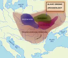 Le berceau originel des Protoslaves à la fin de l'Antiquité, si l'on en croit les témoignages archéologiques, pourrait se situer dans le bassin du haut-Dniepr, dans les régions comprises entre, au nord, la Daugava (Dvina occidentale), à l'ouest le San, au sud le Boug méridional, et à l'est le Don. Ces régions de plaine boisée, aujourd'hui situées en Ukraine nord-occidentale et en Biélorussie, sont celles qui portent les témoignages les plus anciens d'une présence slave (culture de Tcherniakhov).