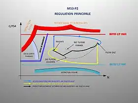 La régulation principale contrôle le régime de rotation et la température à l'entrée de la turbine en maintenant les performances de poussée et de consommation spécifique (CS). En fonctionnement transitoire, elle protège le turboréacteur contre les extinctions (riche ou pauvre), la surchauffe, le décrochage et le décollement tournant.